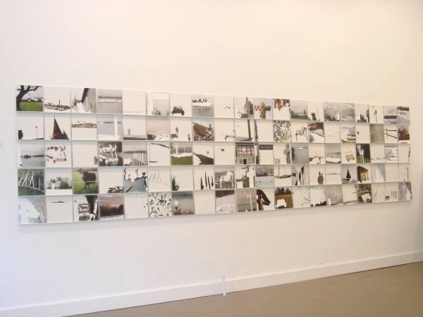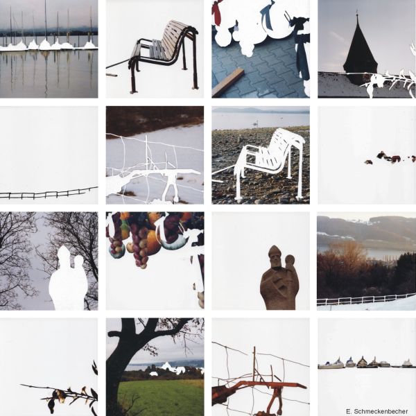 Daneben Eva Schmeckenbechers “Memory”. Die junge Künstlerin aus Stuttgart hat am Untersee fotografiert und ihre Fotos skulptural bearbeitet. Sie trägt einen Teil der oberen Schicht des Fotos ab und erzeugt durch die entstandenen weißen reliefartigen Flächen eine neue Bildräumlichkeit und - wahrnehmung. Die 100-teilige Arbeit "Höri" hat die Künstlerin einem Memory nachempfunden. Wie im Memory tauchen die Bilder wiederholt auf, jedoch nicht als identisches Doppel. Das eine Bild zeigt einen Ausschnitt der reinen Naturlandlandschaft. Hier fehlt der Eingriff des Menschen im Bild. Dort taucht er im Doppelbild "herausgeschält" wieder auf. Zur Ausstellung ist auch das Spiel "Höri-Memory" entstanden.