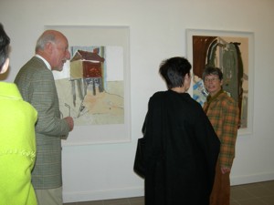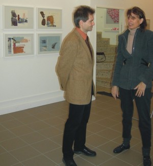 Wolfgang Schmitz und Graziella Drössler vor Drösslers Arbeit "Windschlauch und Land unter Wasser", 2006 Öl, Acryl, Tempera auf Karton