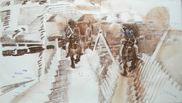 Schmitz, Zeelandreiter zwischen Palisaden, 2006, Lithokreide / Farbstift /