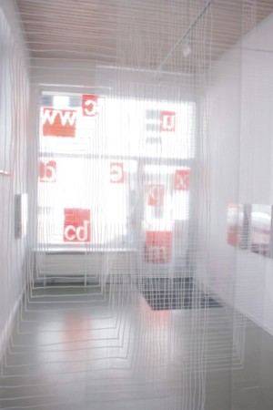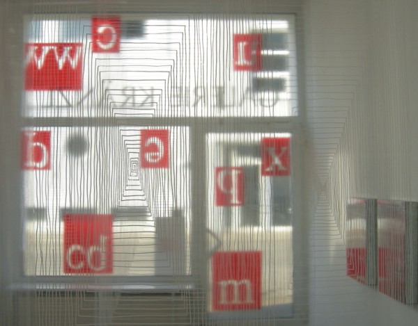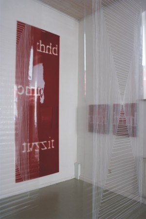 Blick in den vorderen Galerieraum: Danuta Karsten, o.T., 2006, Rauminstallation, 7 transparente Folien, Handzeichnung (Lackstift), je 280x120 cm und Dirk Hupe, o.T., 2006-2007, Textfragmente, U – Profile, Polycarbonat, Retuschierfolie, je 60x50x9 cm und 60x45x9 cm, sowie Folienarbeiten, 2007, 20x30, 50x60, 300x100 cm |