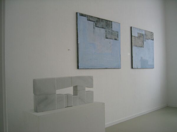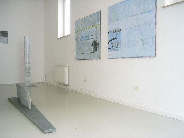 „Kreuzstein“ aus Estremoz (2000). Der quadratische Stein ist in vier Teile unterteilt, die einen Durchblick in Kreuzform erlauben. Das Kreuz als Urform, nicht nur in der christlichen Welt, betont die Vierteilung und wird von der zweifach angedeuteten Dreiecksform ergänzt. Quadrat, Dreieck und Kreuz: archaische Zeichen, die durchgängig in fast allen Kulturen auftauchen. Rotraud Hofmann hat dieses vierteilige Grundmuster überzeugend abgewandelt. Es sind Meditationsformen, die den Mandalas des östlichen Kulturraumes entsprechen. Die Formensprache der Künstlerin können wir leicht wahrnehmen, wenn wir uns auf den Stein einlassen. Und vergleichbar ist die Sprache der Malerin Iris Flexer, bei der die Farbe, der Pinselduktus als wichtiges Element hinzukommt und den strengeren Formenkanon der Steinbildhauerin umspielt. Text: Ingeborg Bauer |