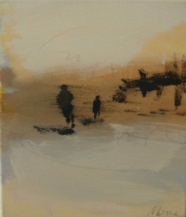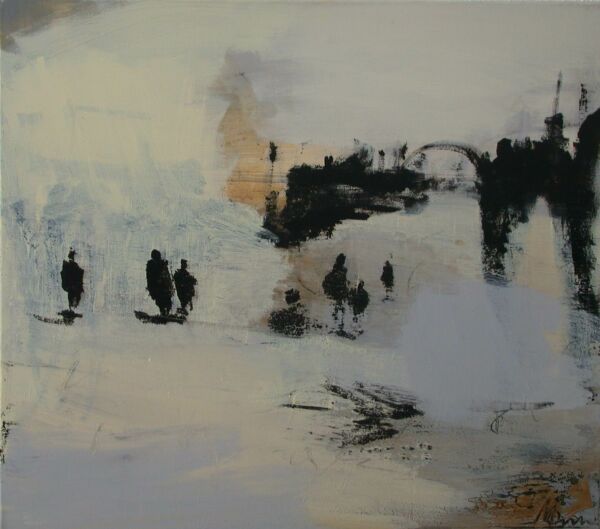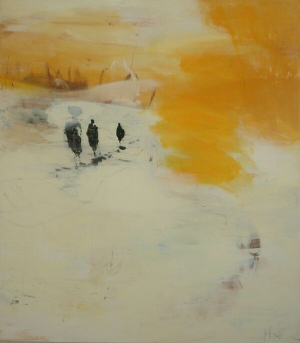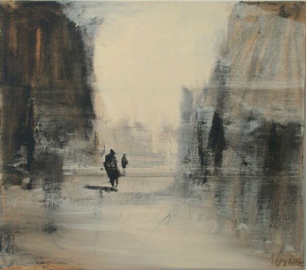 Jürgen MaroseIn seinen Bildern erscheint der Mensch in Rückenansicht, wie er bei Caspar David Friedrich vorgeprägt erscheint. Seine Menschen, Umrissfiguren, Schatten, die selbst schon durch die angewandte Technik brüchig, in Auflösung erscheinen und sich in einen Raum begeben, der selber ohne verlässliche Perspektive ist, in dem sich der einzelne isoliert, sich selbst zu verlieren droht. Jürgen Maroses Räume, in die sich seine Menschen nur zögerlich begeben, sind Wüstenräume, rudimentäre Landschaften, eine Fata Morgana, eine Spiegelung, in der sich der Mensch wie im Nebel verliert. Der Mensch auf dem Weg, allein oder mit anderen, in freie Räume, in enge Schluchten, immer aber mit unbestimmtem Ziel. Jürgen Maroses Räume werden jedoch zunehmend lichter, andererseits werden die von Zerstörung geprägten Stadtlandschaften bedrückender. Es bleibt dem Betrachter überlassen, ob er Wolkenspuren oder Menetekel erkennen will.