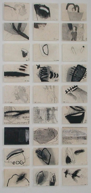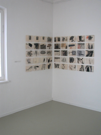 Annemarie Laner, „one a day“, 2002, ca. 22x15 cm, Arbeiten auf Nepalpapier Annemarie Laners kleine Zeichnungen auf Büttenpapier fordern per se Intimität und Nahsicht. Linien, Flecke, Zeichnungen, Archaisches, kindliches Gekritzel, Comicartiges, Hieroglyphen, dann wieder realistische Abbilder und immer wieder das Vexierspiel zwischen Schriftbild und Bilderschrift locken unseren Spürsinn, ebenso die mannigfaltig anklingende Auseinandersetzung mit der Geschichte der Bildkunst...Das Datum am unteren Bildrand führt uns auf eine wichtige Fährte im Hinblick auf das zu Grunde liegende Konzept. Annemarie Laners Serie beruht auf einer klaren Arbeitsstrategie: Ihre Blätter sind Tagesnotationen: jeden Tag entsteht ein Blatt ... Ihren zeichnerischen Notaten haftet ein Doppelanspruch an: Lockerung, Öffnung und Durchlässigkeit des sinnlichen Vermögens in der Geste auf der einen Seite und Konzentration des Bewusstseins, Akribie, auf der anderen Seite. Annemarie Laner liefert uns Zündstoff für die Kräfte unserer ureigenen Phantasie. Wir assoziieren vielleicht einen misslungenen Tag, ein fruchtbares Gespräch, ein inspirierendes Buch oder Bild, ein Augenblick des Glückes, die Leere im Kopf, Ängste und Träume. Unwillkürlich integrieren wir diese Bilder, unsere eigene Geschichte modellierend, um zugleich den Künstlern ihr autobiographisches Geheimnis zu überlassen. Dr. Annett Reckert, Kunsthalle Göppingen
