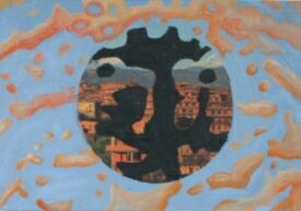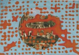 In „Sao Paolo“ und „Israel“ sind zwei große Leinwände collagemäßig beklebt mit kartographischen Aspekten. Als Übermalung benützt Cristina Barroso die Struktur von visualisierten Magnetfeldern. In Sao Paolo konzentrisch um einen Mittelpunkt, die Farbe rot-orange; das hat für sie mit Sonne, Wärme, Leben zu tun, mit Klima und körperlich psychischer Empfindung. Über Israel und besonders Jerusalem liegt eine Bogenform, klassisch für einen Magneten mit zwei Polen – plus und minus. Der Bogen als Tor – Jerusalem ist für drei Weltreligionen der wichtigste und dem Jenseits der nächste Ort. |