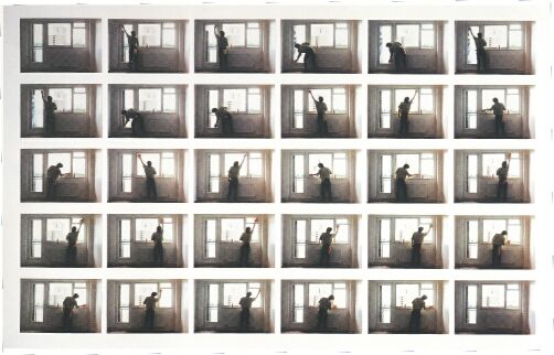 Die Grundlage für Philip Reillys Fotoreihe „Cleaning“ bildet eine auf ihr Wesentliches konzentrierte Handlung, das Fensterputzen. Auf der einen Seite sehen wir die wesentlichen Momente, die Eckdaten des Tuns. Auf der andern, das Fensterputzen in einem übertragenden, metaphorischen Charakter, festgemacht am Fenster als Bild im Bild. Wir sehen das Bild hinter dem Fenster, fokussiert in der Scheibe und ihrem Rahmen, dann wird es unscharf, während er putzt und das Schema seiner Bewegungen realisiert. Im Machen ist das Sehen getrübt, um wieder in noch präziserer Klarheit zu erscheinen. |