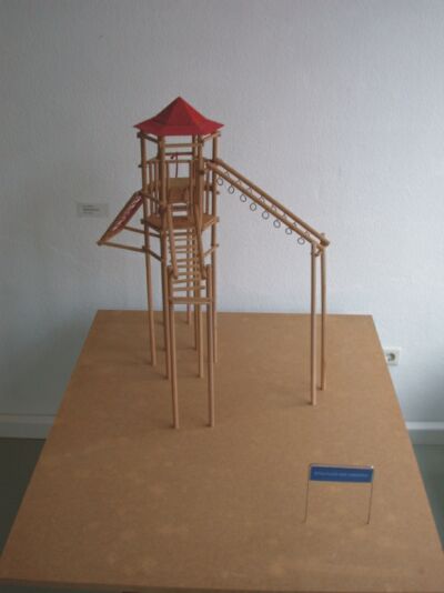 „Spielplatz der anderen“ ist der Titel eines bildhauerischen Projektes, hier als Modell im Maßstab 1:10 zu sehen. Das handelsübliche Spielplatzhaus wird einfach auf Stelzen gesetzt, eine Metapher für den öffentlichen Raum. Damit entsteht ein Gefühl, eine Spannung zwischen Begehren und Ausgrenzung. Der Spielplatz wird zur Skulptur, zum reinen Anschauungsobjekt. Öffentlichkeit und Kinder haben Zutritt und doch keinen Zugang. Die bis jetzt in Nienhagen ausgestellte Skulptur wird nun demontiert und als Spielplatz in ein Neubaugebiet eingegliedert. |